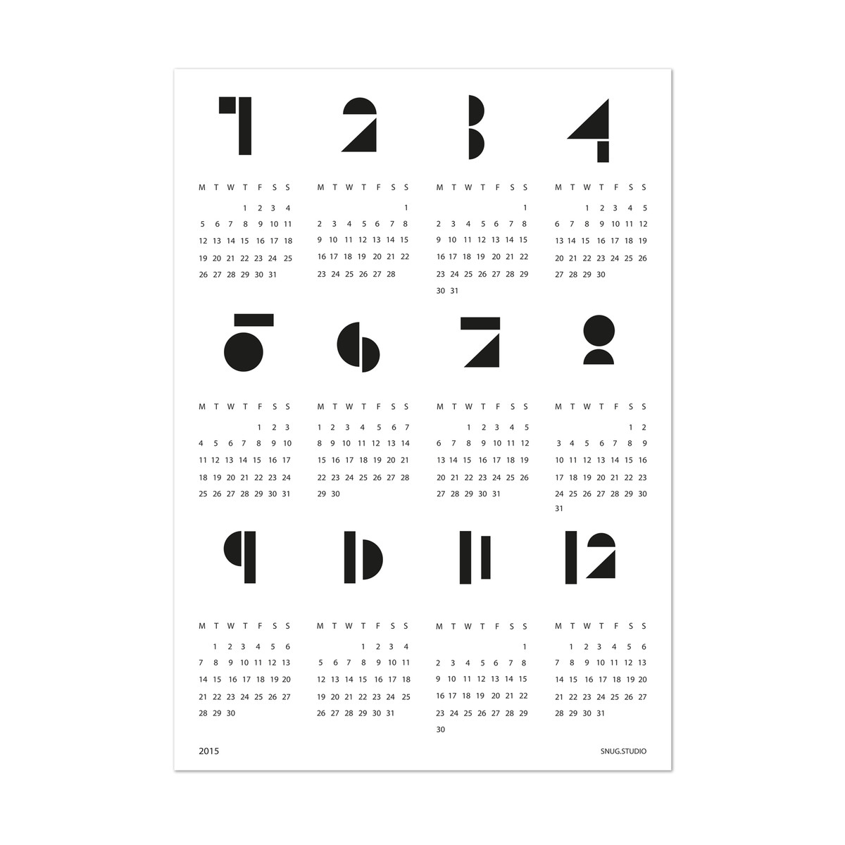 The single months are assorted in an overview of blocks. Each month number consists of simple geometrical forms, such as spheres, half-spheres and squares. Copied from construction bricks, the calendar acts playful but abstract and artistic at the same time. That’s how the snug.calendar finds a place nearly everywhere – whether in the office, the living room, the children’s room or the kitchen, elegantly framed or fixed with adhesive tape, in sophisticatedly furnished houses or in student’s apartments: The snug.calendar fits in everywhere.